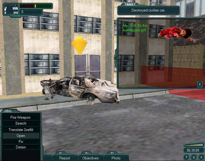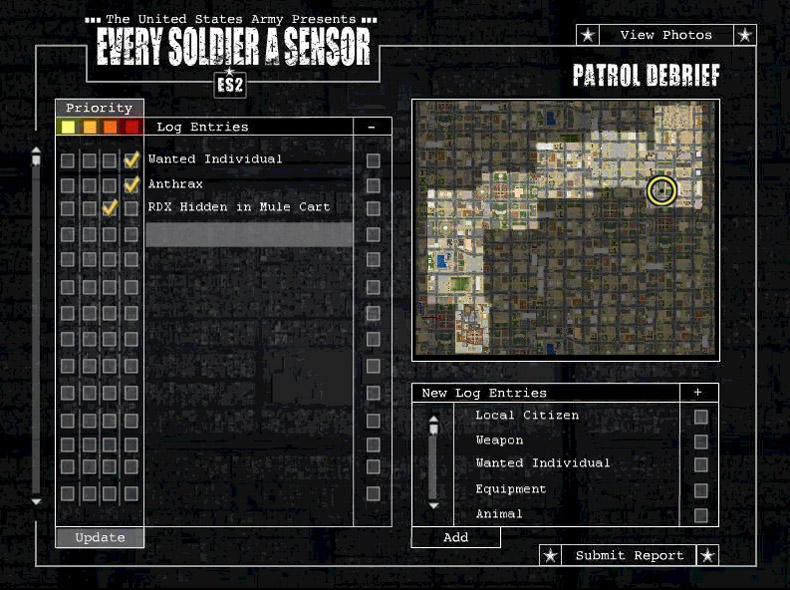 Soldiers navigates the urban terrain populated with civilians, security personnel, NGOs, and insurgents, to detect threats while attempting appropriate interaction with everyone encountered. Scoring takes into account objects reported and an Information Operations indicator reflecting success in civilian interactions.